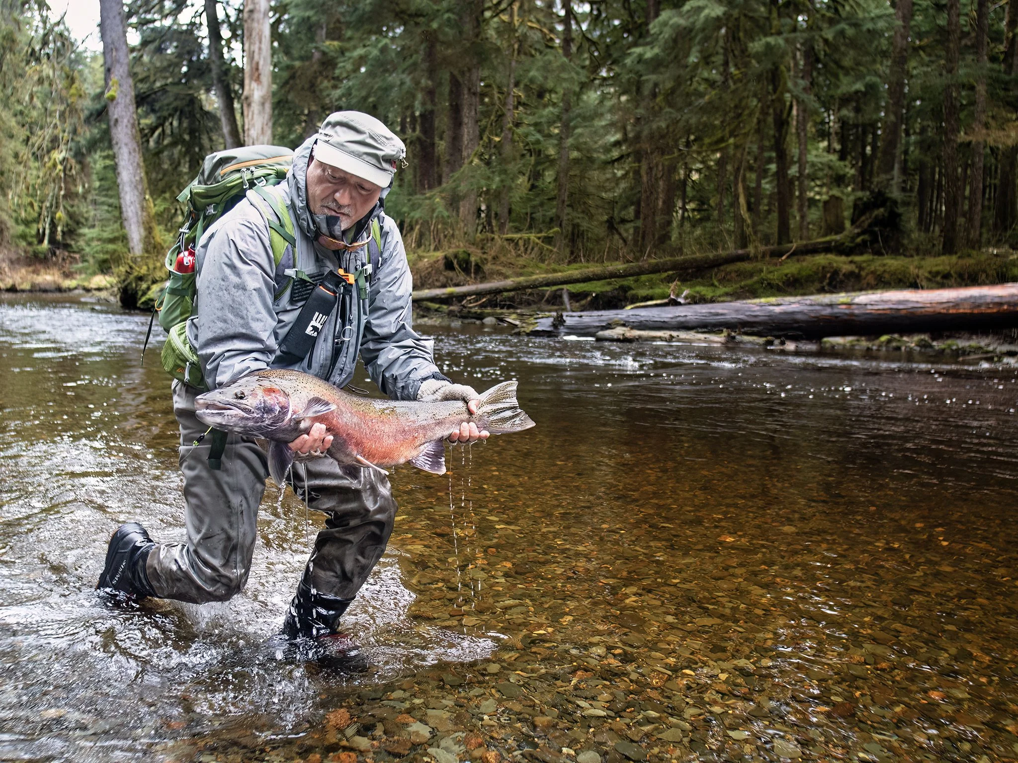 The next three days are spent exploring the smooth lower river and two or three miles of dancing, hemlock-lined upper section. Each day brings more steelhead: dark bucks to 8, 10 pounds, black-spotted and scarlet-shouldered, with hooked kypes and determined glares. There are also hens, slightly smaller, colored more like the silver raindrops that hang glittering from my ferrules. The fish aren’t particularly large as steelhead go. But of course, that’s not the point. Beyond the catching, the beauty of my time here is in having a river of steelhead entirely to myself. It’s high-yield, low-impact wilderness fishing for gems, which these days has grown all too rare.