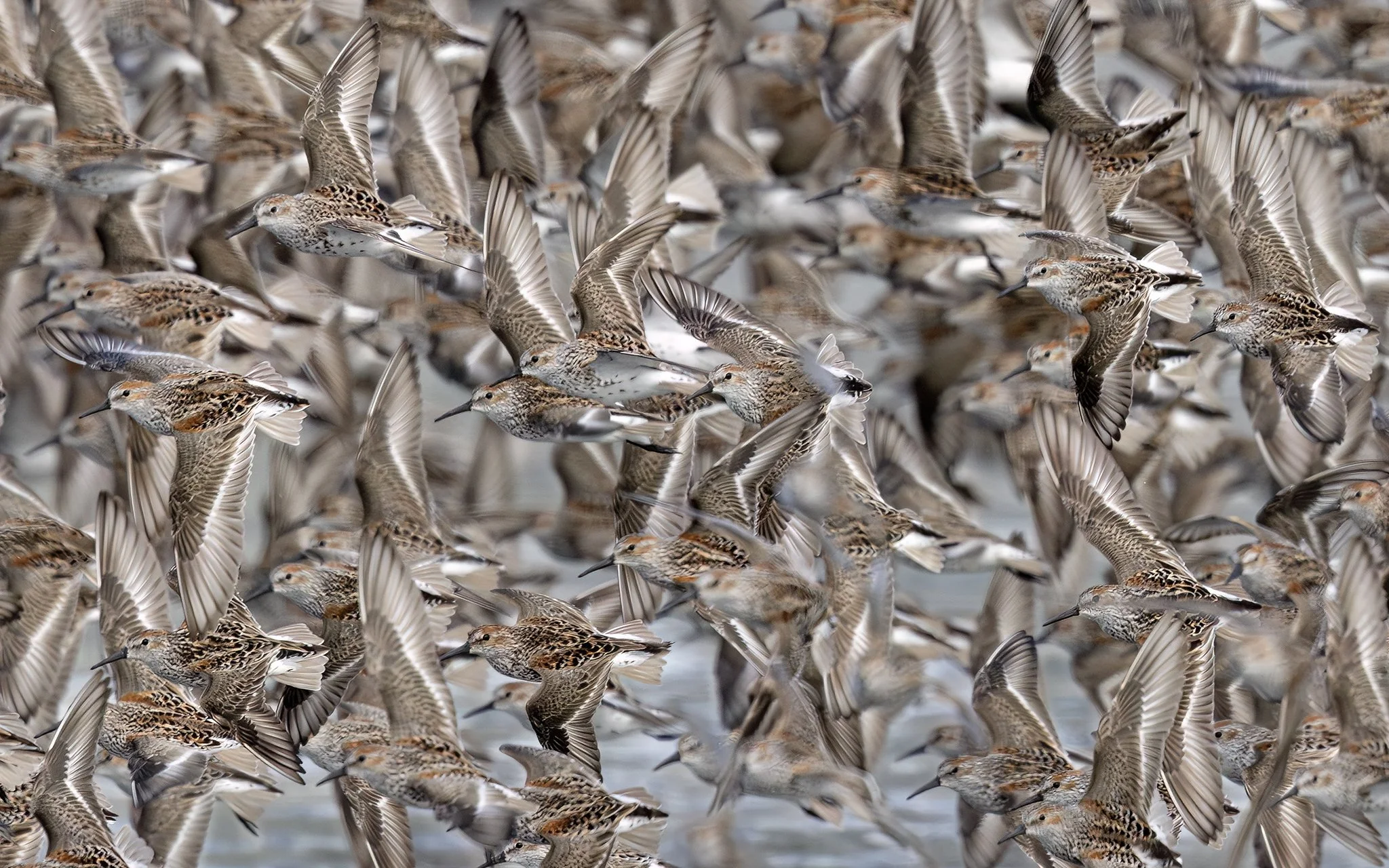 Within 20 minutes, the dunes dissolve into the shallow, mile-long lake, knee-deep, brackish, backed by the spongy bog I’d seen from the plane. Shorebirds storm the sky. Western sandpipers, dunlins, plovers, dowitchers, and others whistle overhead in great flocks, jinking in single-minded, mass unison. Sandhill cranes meander, circling and gliding high above, calling with cracking voices. Trumpeter swans honk, and geese of all kinds yelp in northbound gangs. From the bog, a stench that is rich, repulsive, sulfuric, stains the air; pintails, wigeons, shovelers, and teal in flocks of hundreds roar out of the stinking grass. The hiking now is slow, each step uncertain, painful for soft, winter-fat thighs.
